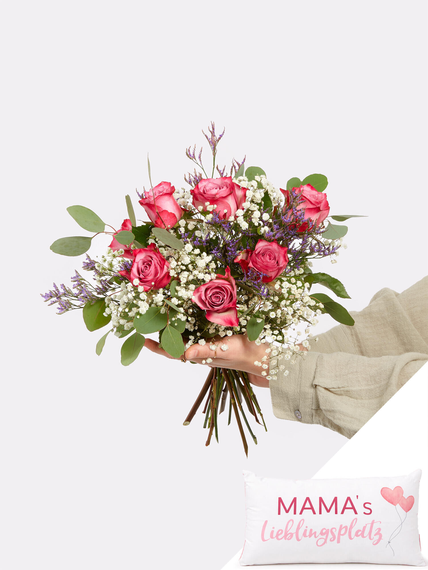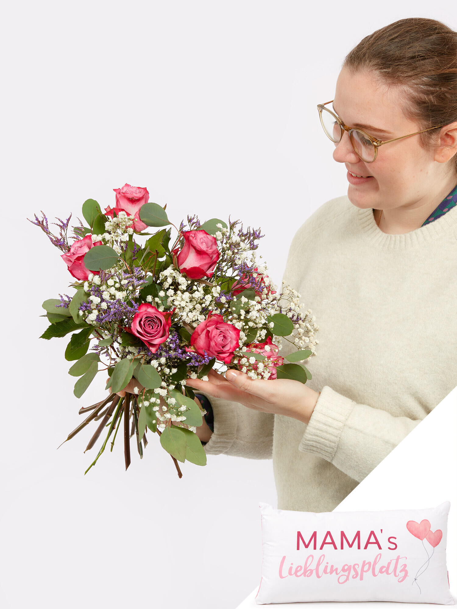 Die Rosen stehen für Wertschätzung und Zuneigung, während das Beiwerk dem Arrangement eine natürliche Leichtigkeit verleiht. Ergänzt wird das Set durch das stilvolle Deko-Kissen, das auch über den Moment hinaus Freude bereitet und als liebevolle Erinnerung bleibt.