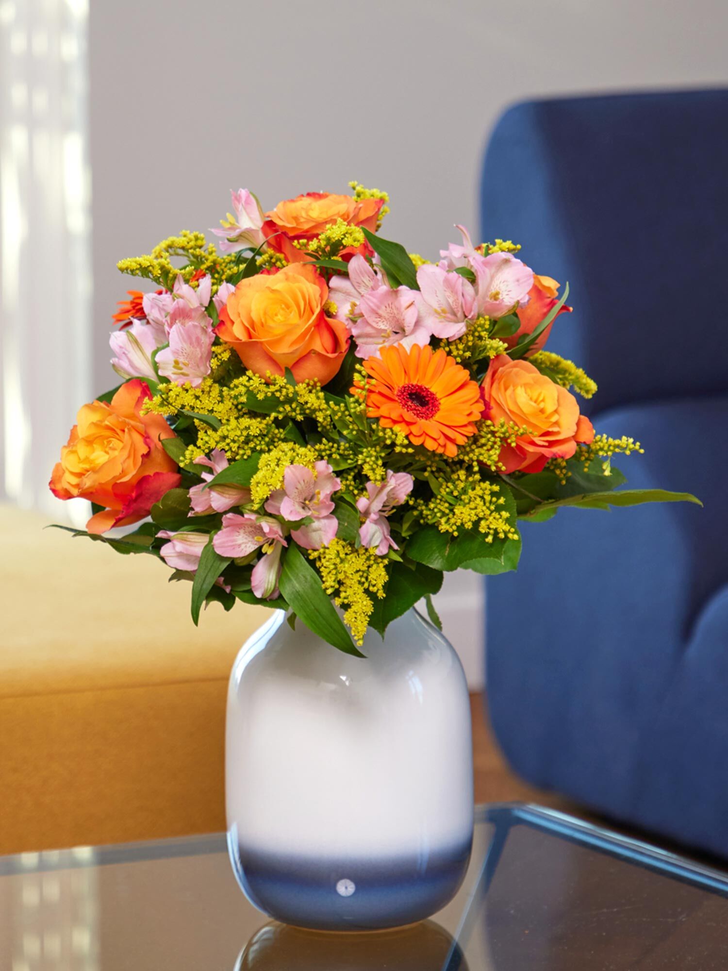Dieser fröhliche Blumengruß besteht aus sonnigen Gerbera, leuchtend orangefarbenen Rosen und Inkalilien (Alstromerien) in zartem Pink. Die strahlenden Farben und die frische Optik der Blumen lassen das Herz des Geburtstagskindes auf jeden Fall höher schlagen.