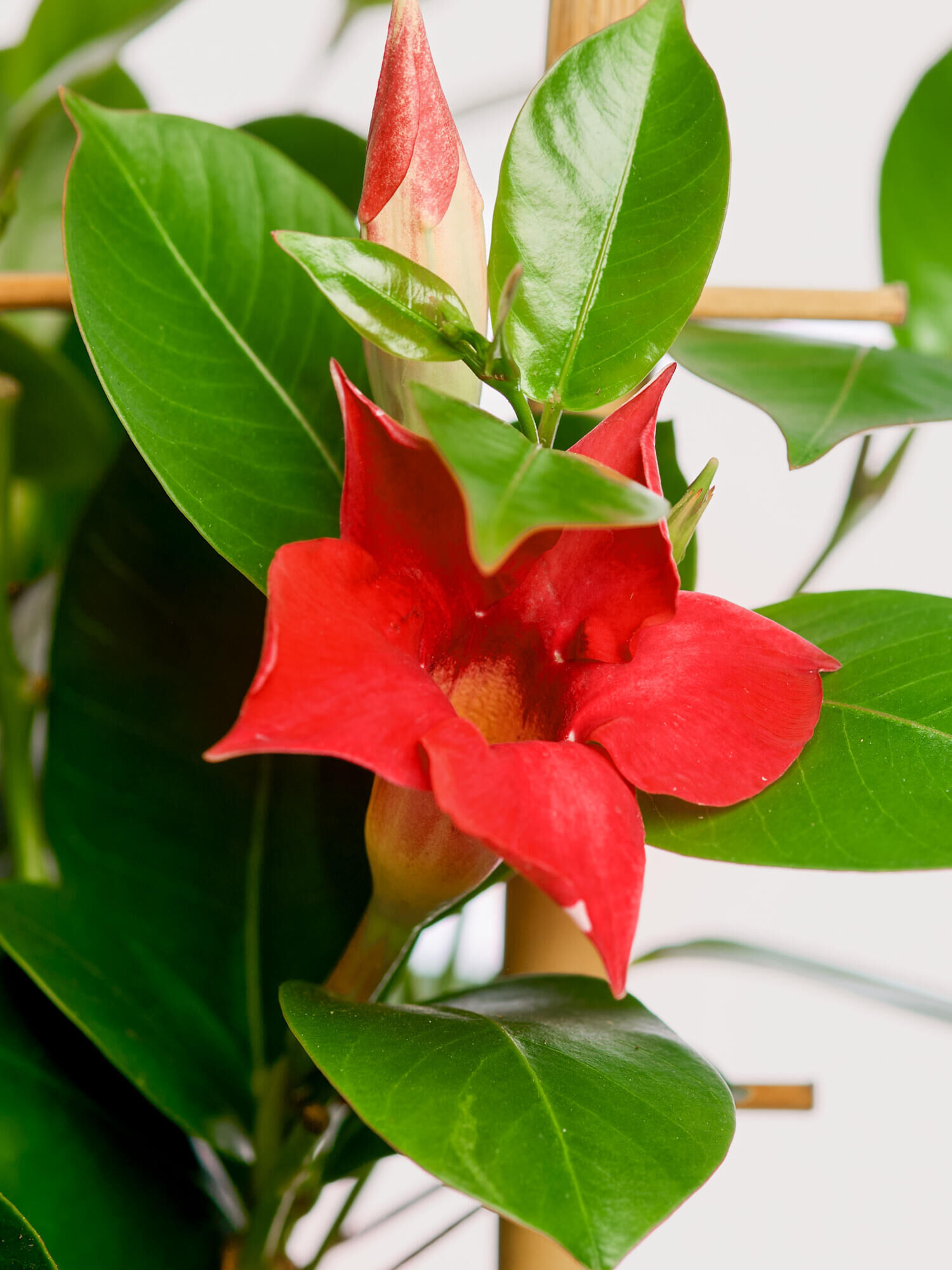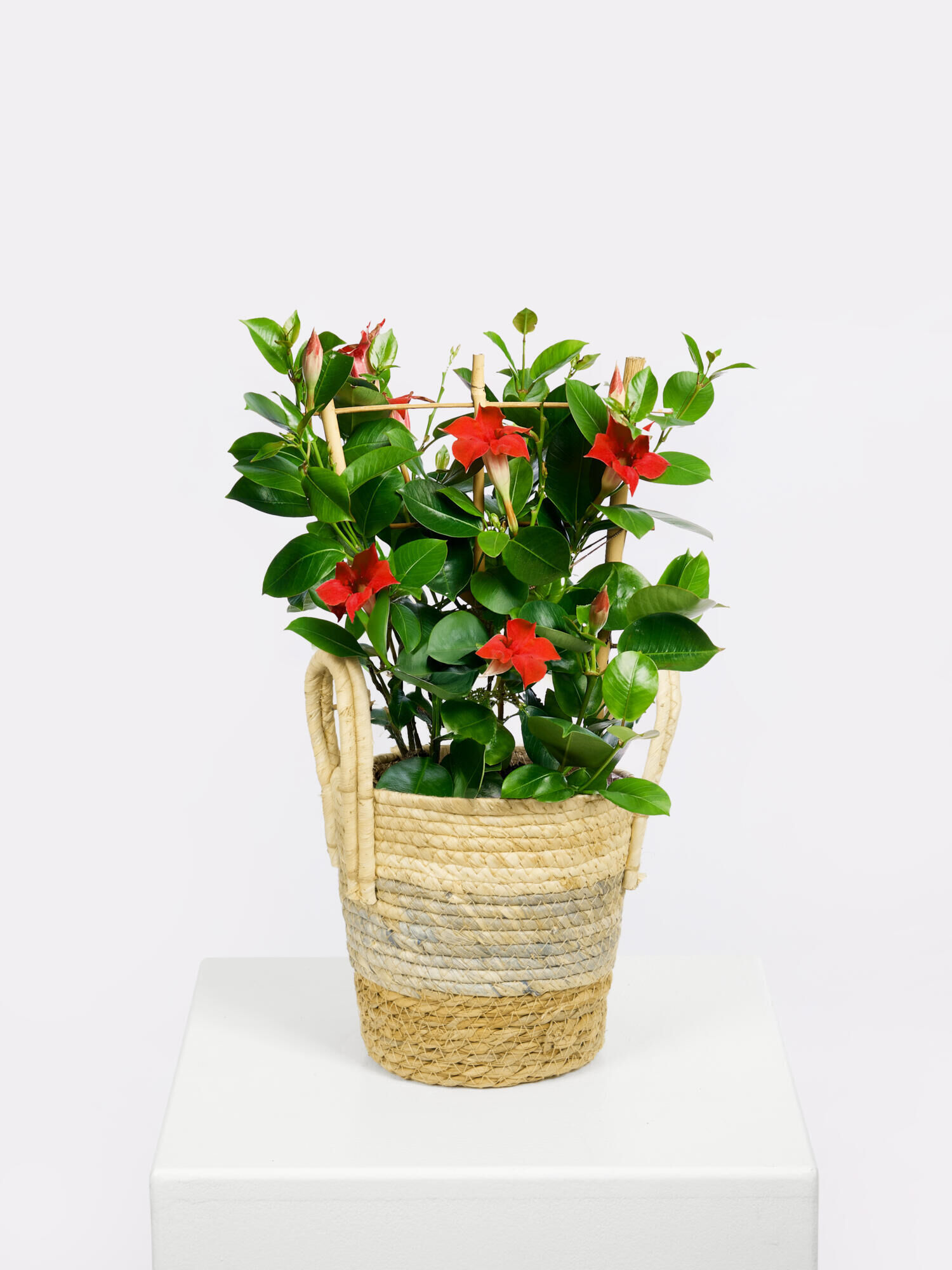 With its bright pink blooms and glossy green leaves, the mandevilla creates a cheerful yet elegant atmosphere. The natural basket pot enhances its modern, cozy look, making it a stylish eye-catcher for your living room, balcony, or terrace.