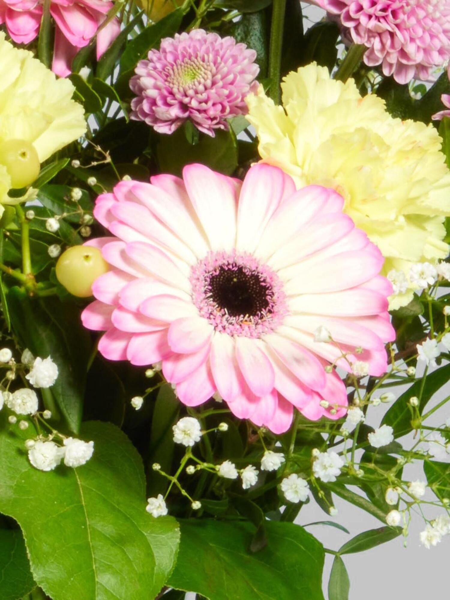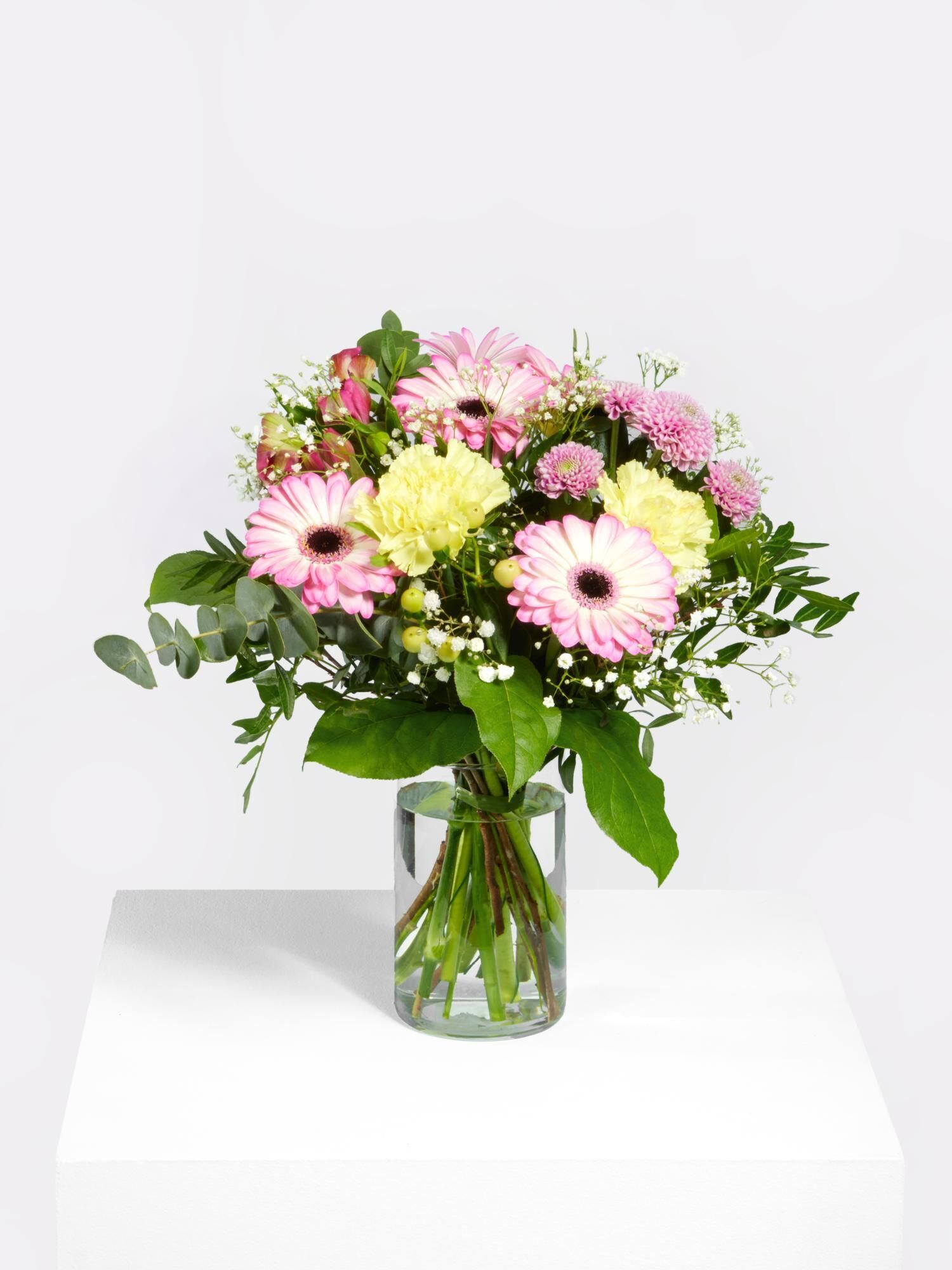 Delicate gerberas, playful alstroemerias and bright yellow carnations come together in a harmonious arrangement. Finished with light foliage, the bouquet has a natural and airy feel.
