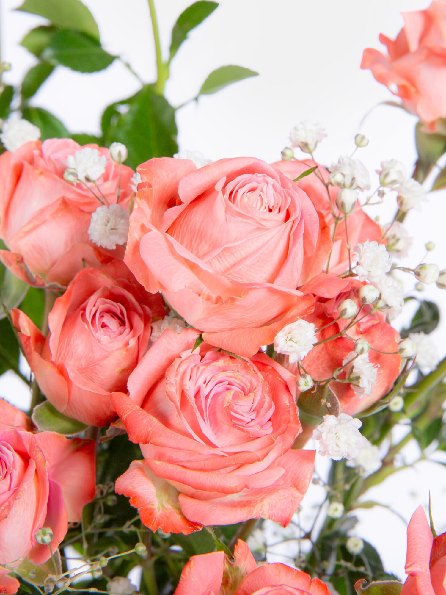 A delicate floral greeting full of love: this romantic bouquet of branching roses in soft pink tones is complemented by airy gypsophila, creating a light and elegant look.