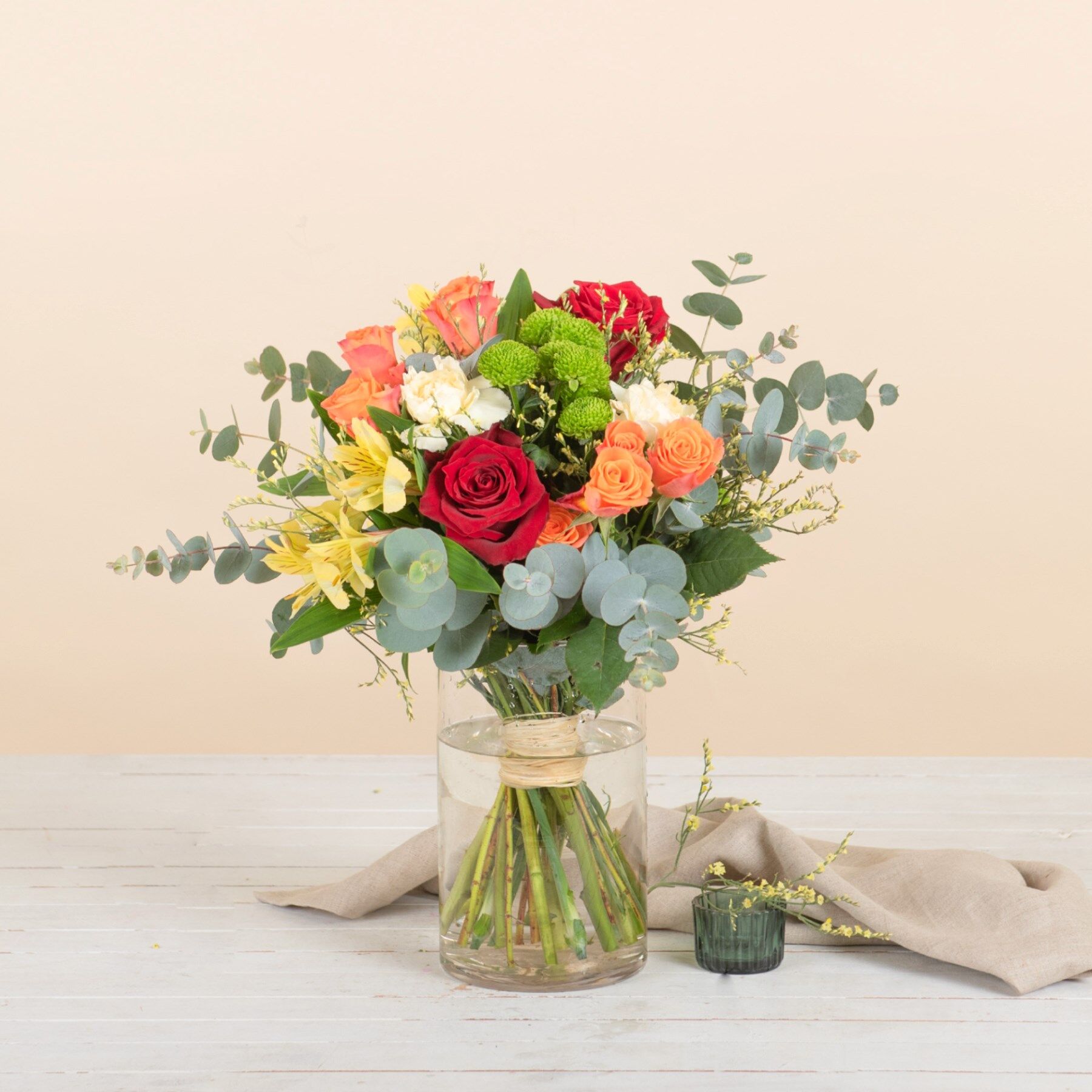 The Joy bouquet combines the lively tones of orange spray roses with the intensity of red roses, accompanied by light yellow alstroemerias, cream carnations, yellow limonium and green santini chrysanthemums. Cinerea eucalyptus adds a fresh and natural finishing touch.