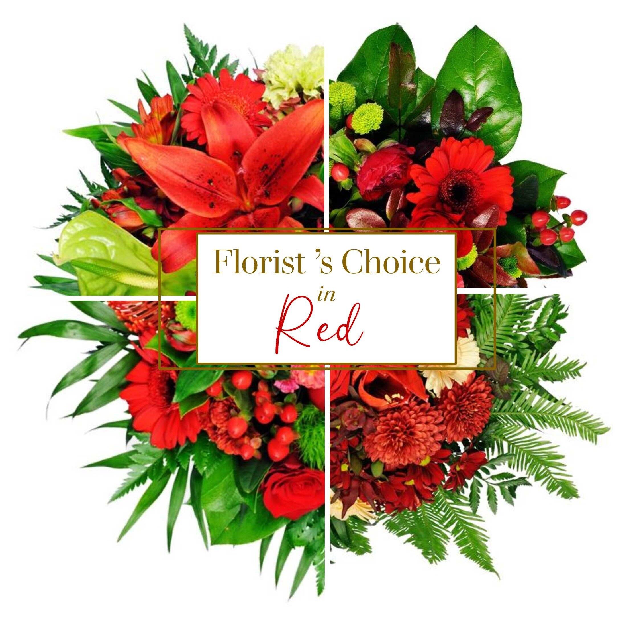 Don't worry about choosing. Let the florist put together a delightful floral gift on your behalf. The florist will carefully craft this attractive, red bouquet, using a mixture of flowers in season at the time. That means that every bouquet will be totally unique.