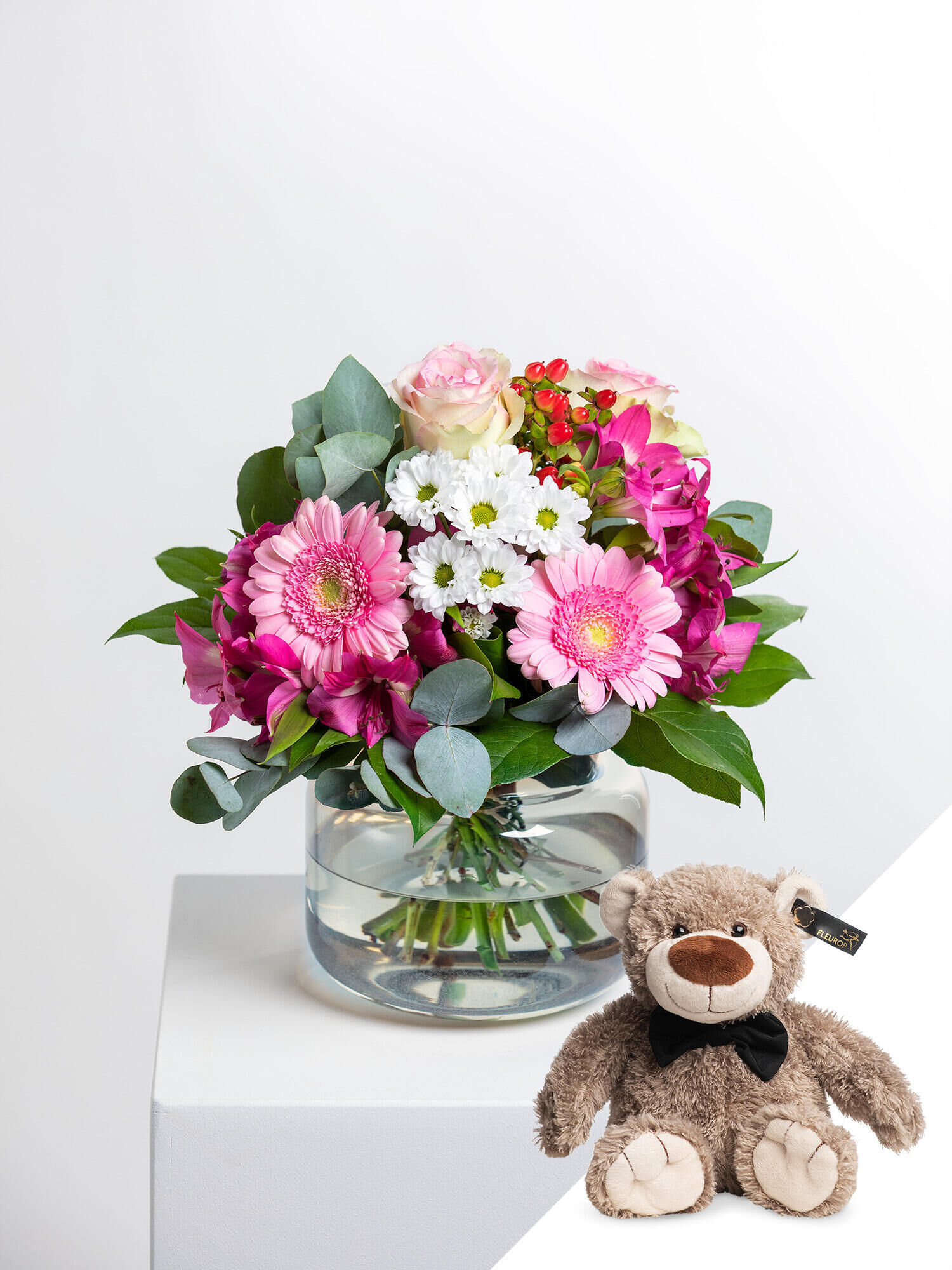 Rosa Rosen stehen für Zuneigung und Glück, während rosa Germini, pinke Alstroemeria und weiß blühende Santini dem Arrangement eine fröhliche, lebendige Ausstrahlung verleihen. Leuchtendes rotes Hypericum setzt kleine Farbakzente und sorgt für eine verspielte, liebevolle Note.