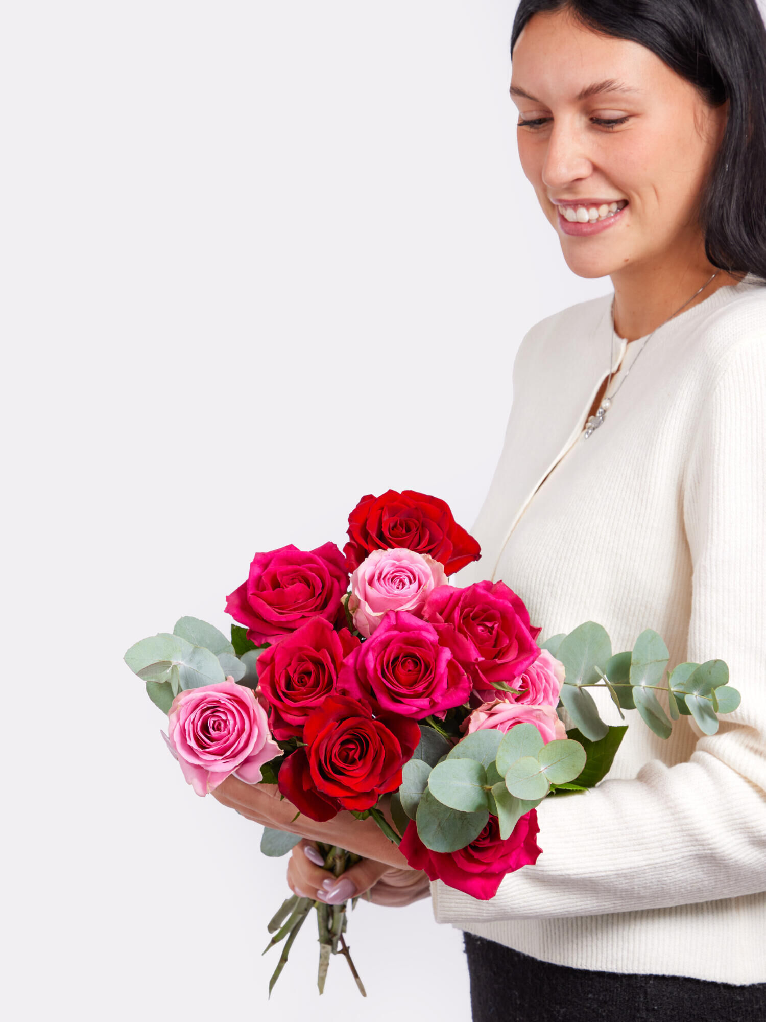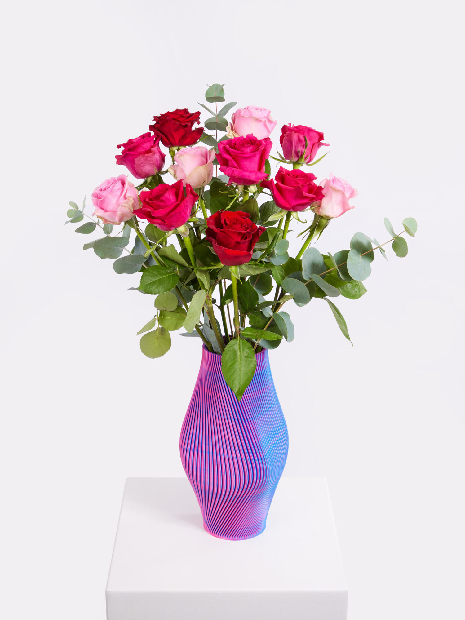 Leuchtend rote und pinkfarbene Rosen treffen auf sanfte roséfarbene Blüten und werden von frischem Eukalyptus stilvoll begleitet. Die unterschiedlichen Farbnuancen verleihen dem Strauß Tiefe und Dynamik – modern, edel und gleichzeitig romantisch.