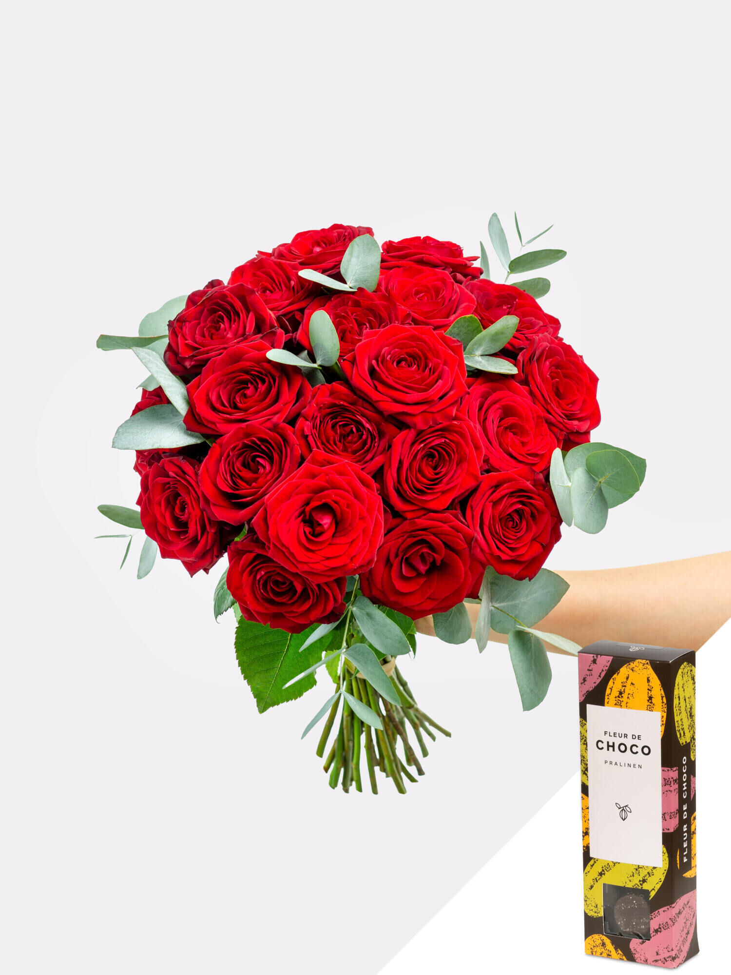 Lang gebundener Strauß mit hochwertigen, großköpfigen roten Rosen sowie etwas Eukalyptus als Beiwerk. Das Produkt wird mit Fleur de Choco ausgeliefert.